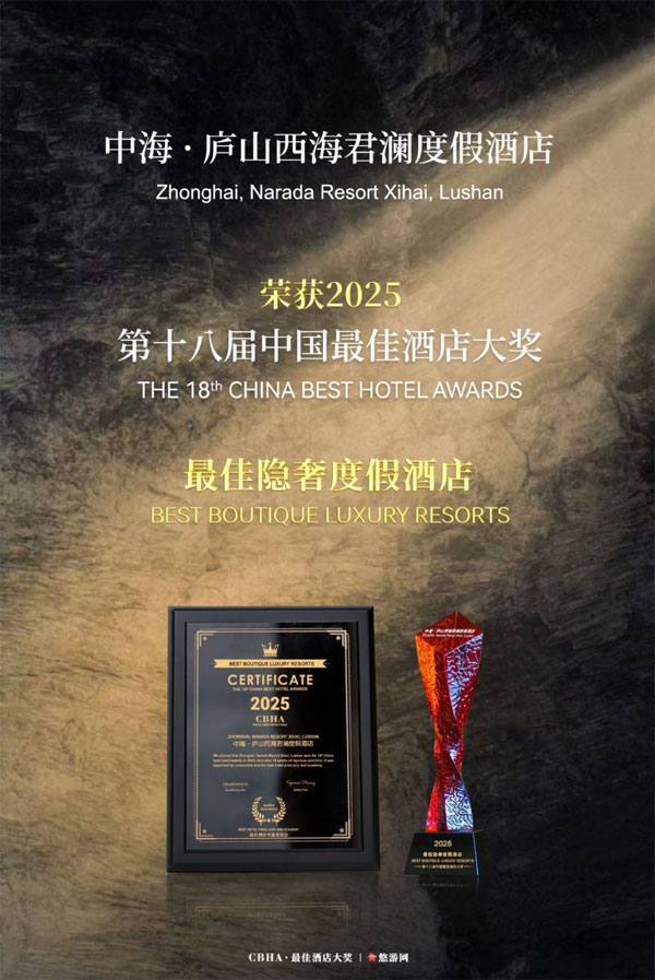 近日,2025第十八届中国最佳酒店大奖评选活动在上海正式落下帷幕,中海·庐山西海君澜度假酒店从众多国内国际品牌酒店当中脱颖而出,荣获2025年度“最佳隐奢度假酒店”大奖殊荣。