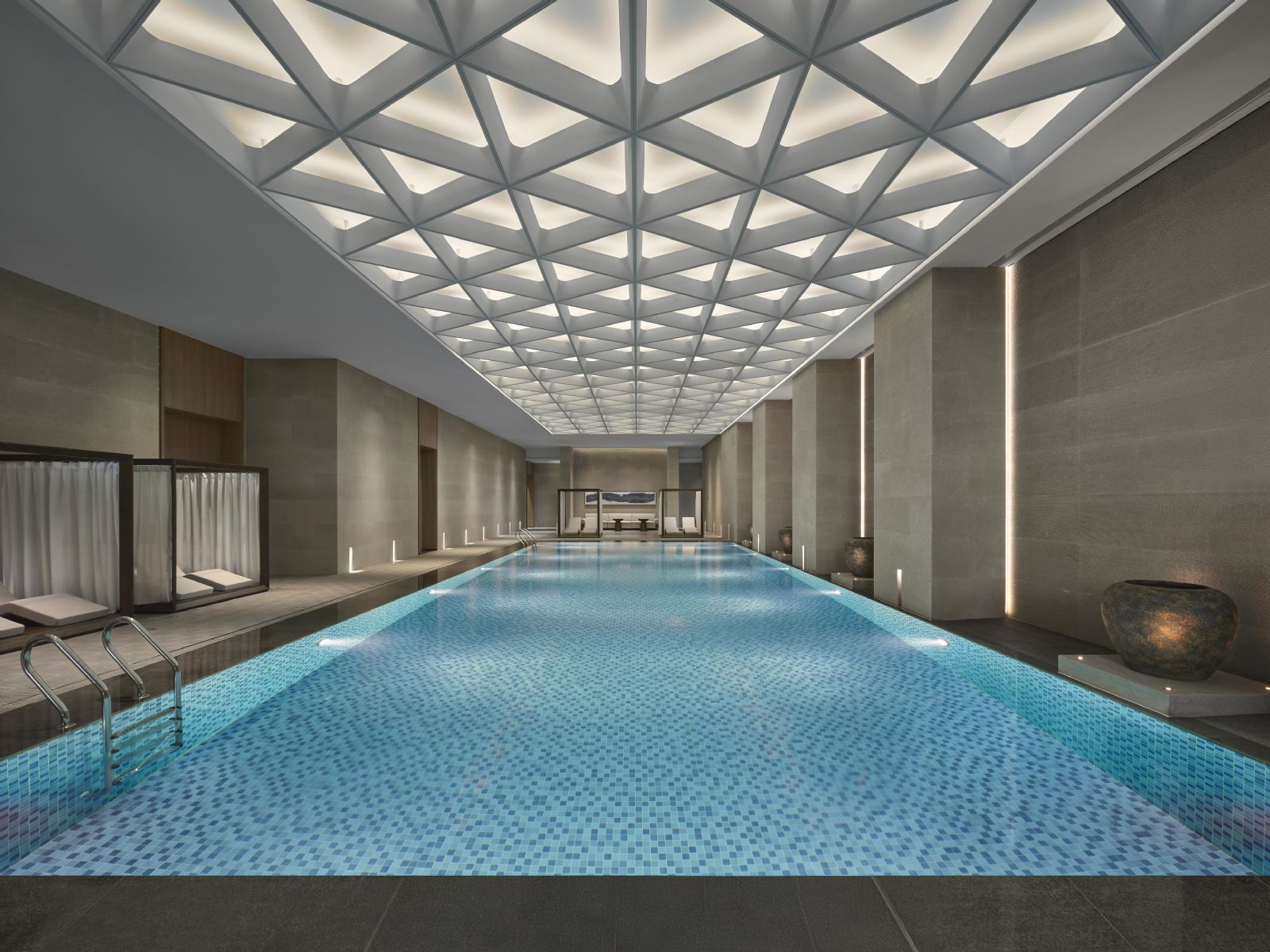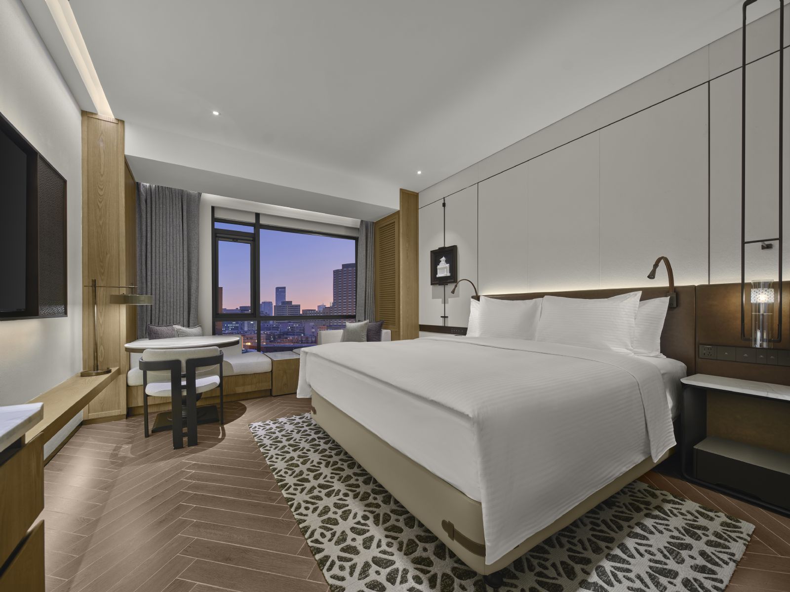 室内恒温泳池与24小时健身房,为宾客提供全天候运动休闲选择。159间客房采用暖柔色调搭配质感材质,配备高品质床品、高速网络及小度智能客房系统,万悦会楼层更提供专属尊享礼遇。