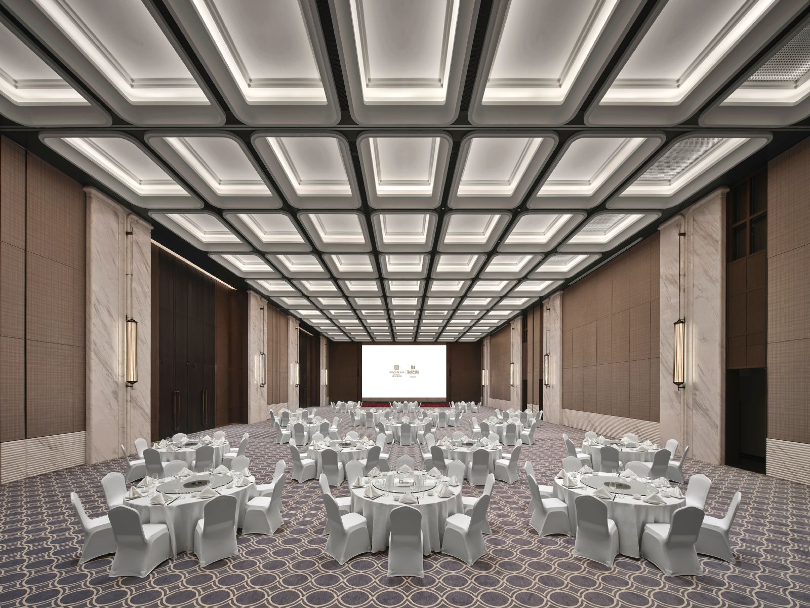 长春万达嘉华酒店以“北国春城・摩登复古”为基调,大堂融合工业齿轮纹样、电影胶片元素与春城绿意,营造出兼具复古韵味与自然气息的社交空间。近900平方米无柱式宴会厅挑高8米,配备先进影音设备;另有6间多功能会议室,可灵活满足各类会议与庆典活动。