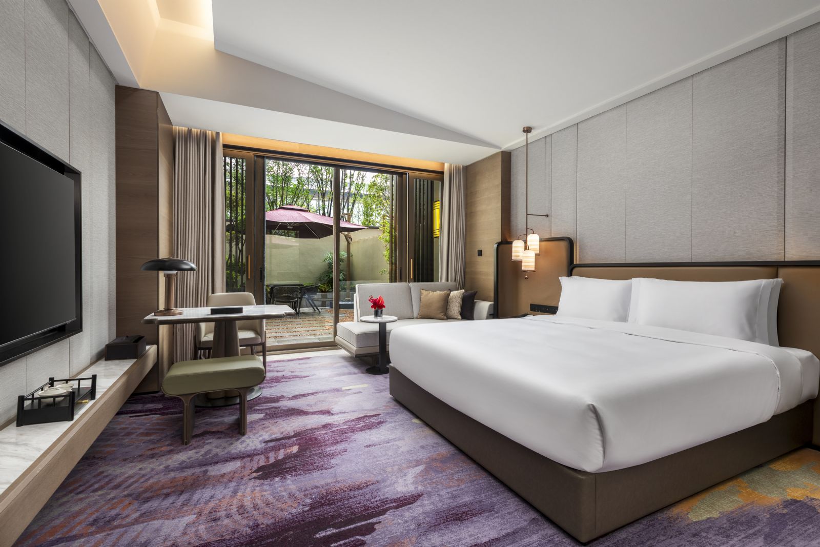 咸阳双照湖假日酒店则以“盛世唐朝”为设计主题,融入“一带一路、开元通宝、马球驰骋”及“琵琶行”等文化元素,在现代空间中重现“多彩盛世”的开放与自信。酒店设有473间舒适客房及套房,满足家庭与商旅客群需求。