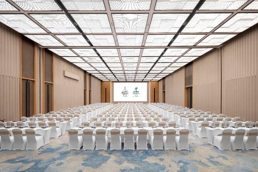 除此之外,酒店群拥有独立的咸阳国际会议中心,位于两家酒店中间位置,共三层,灵活多元的会议与展览空间结合8米挑高空间、两个千平宴会厅及多间多功能厅、高清大屏和灯光音响系统,可以满足不同活动类型及需求。