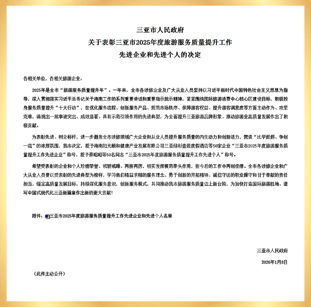 2026年1月8日,三亚绿杉壹居度假酒店凭借在服务创新、品质升级与行业引领方面的突出表现,成功获评“三亚市2025年度旅游服务质量提升工作先进企业”,这份荣誉是对酒店深耕文旅服务的高度肯定。